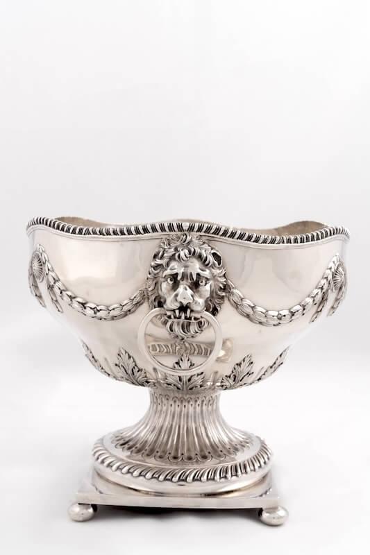 George III, silver punch bowl with lions head and ring handles linked by laurel swags and rosettes. Engraved with the Carroll and Tilghman family crests and believed to have been purchased by the Barrister and Margaret during their 1771 trip to London. Courtesy of NSCDA-MD.