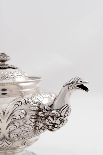 Silver teapot made in Baltimore by A.E. Warner in 1819 for Harry Dorsey Gough Carroll, the son of James Maccubbin Carroll and Sophia Gough. Courtesy of NSCDA-MD.