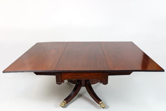 American Empire, Duncan Phyfe-style mahogany dining room table likely made by John Needles, a prominent Maryland furniture maker, Quaker, and abolitionist, circa 1815. Owned by James Maccubbin Carroll. Courtesy of NSCDA-MD.